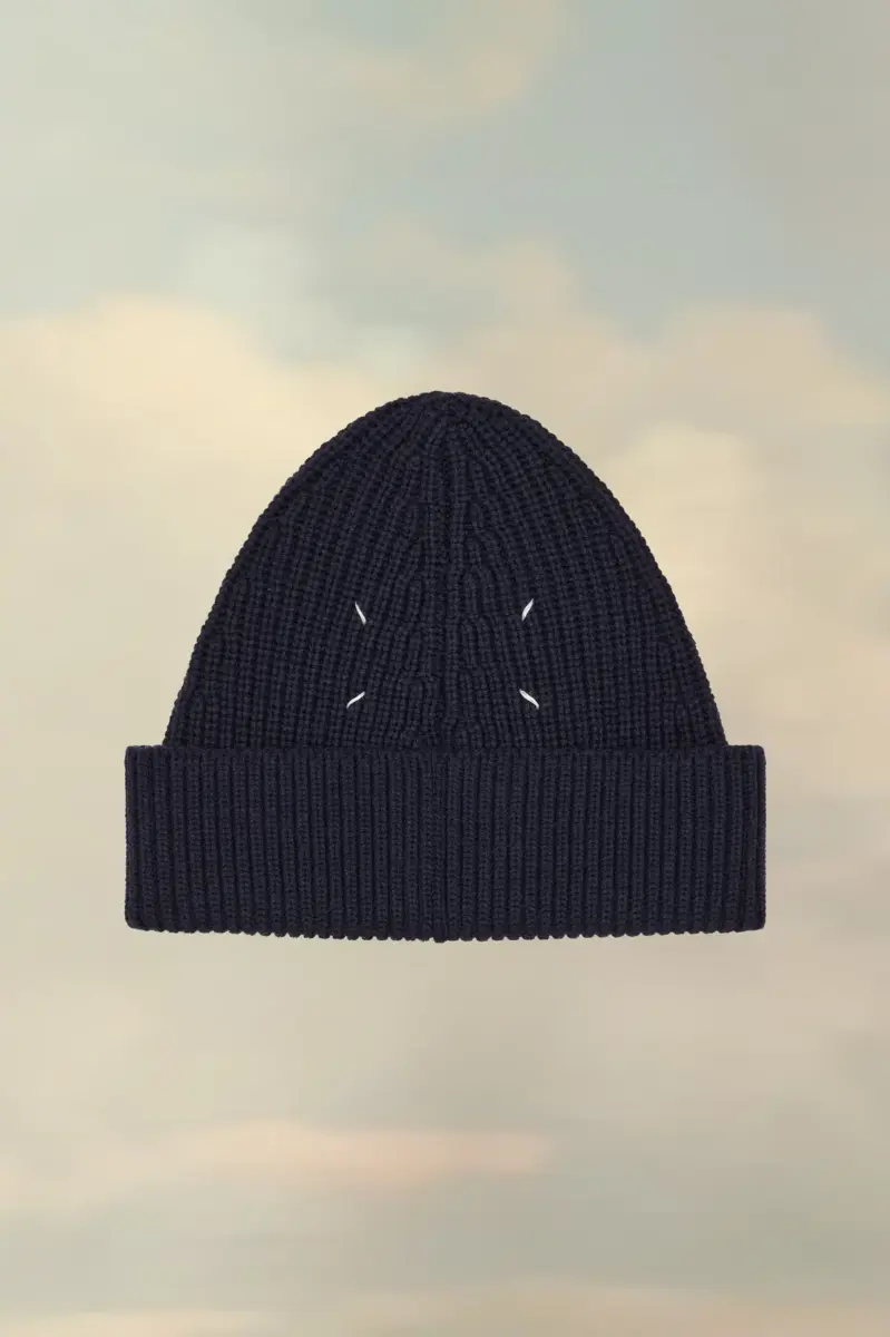 Fisherman-inspired beanie hat in a wool-cotton blend with compact English rib stitch. The Maison’s four-stitches moniker adorns the front.