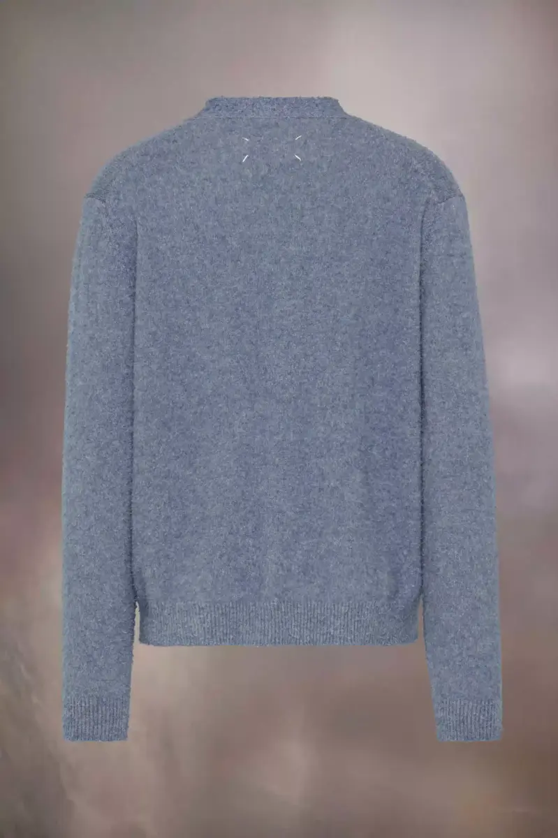 Crafted from a Shetland wool-cotton blend, the cardigan is deliberately pilled to evoke lived-in nostalgia. It features a low V-neck, dropped shoulder seams and round buttons, with ribbed detailing at the cuffs and hem for added texture. The large volume is inspired by traditional British outdoor clothing. Maison Margiela’s signature, the four stitches, appear at the back; the opposite of a label.