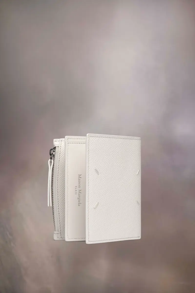 The wallet is crafted from grainy leather and features eight card holders, a zipped purse and the logo across three sections. Maison Margiela’s signature, the four stitches, appear on the back; the opposite of a label.