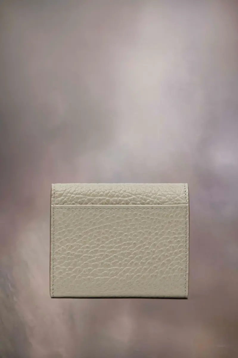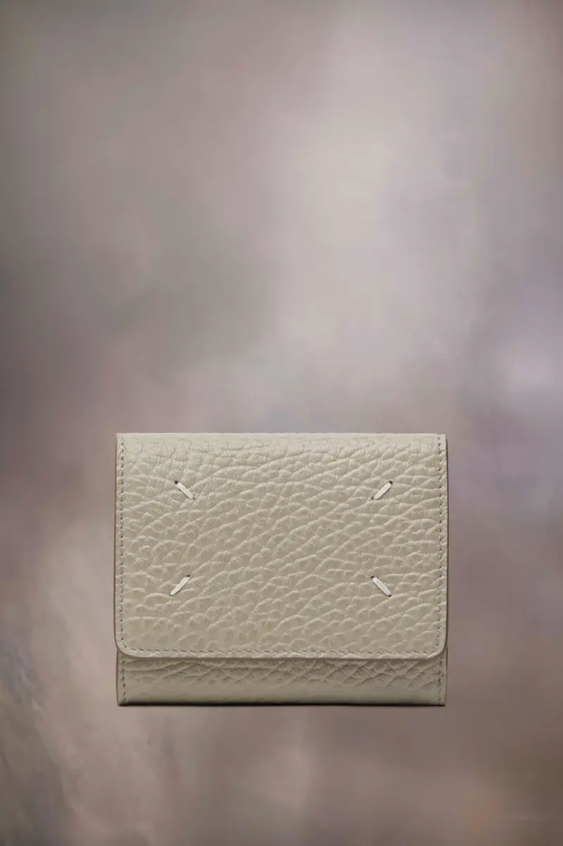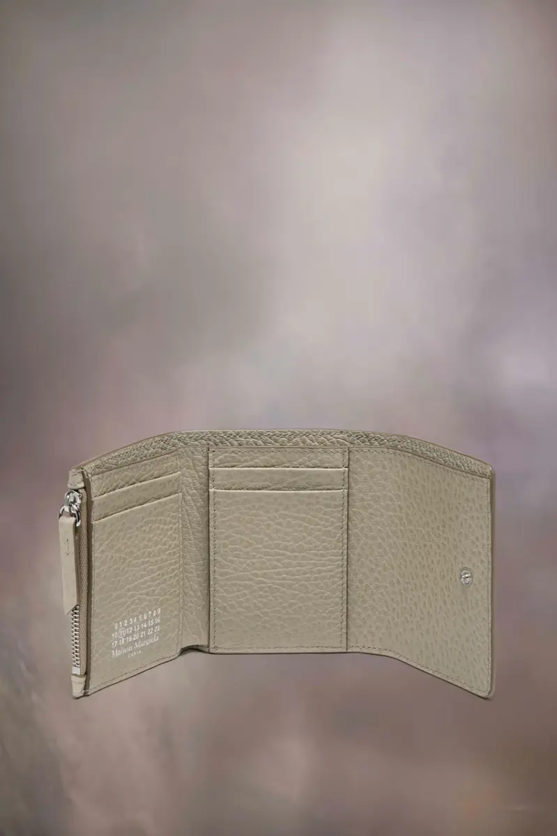 In embossed grainy leather, the wallet features the numeric logo inside with four card holders and a zipped section. Maison Margiela’s signature, the four stitches, appear on the back; the opposite of a label.