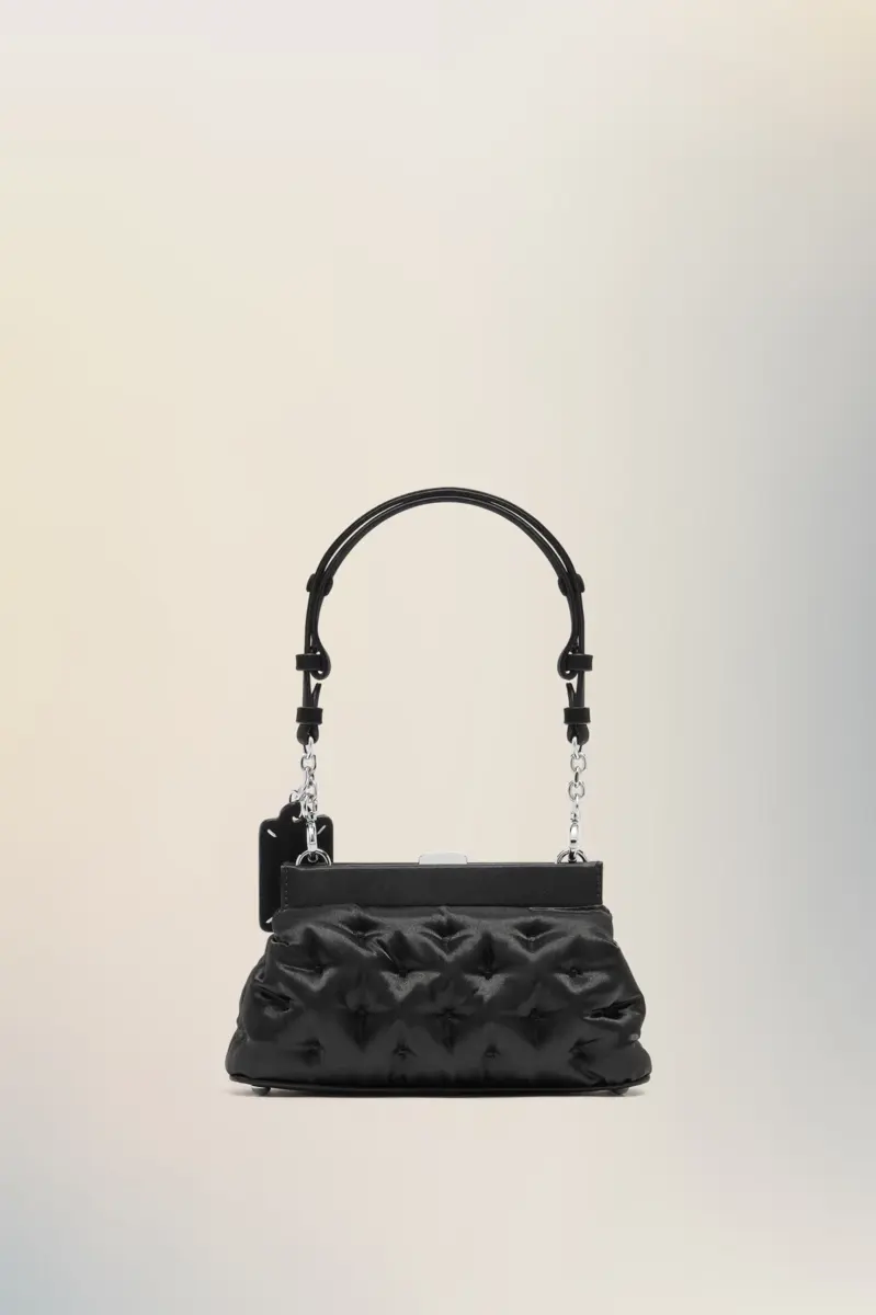 The Glam Slam evening bag reimagines the Maison’s signature padded shape in delicate satin. Silver-tone hardware lends a graphic edge, while the soft body stays true to the tactile language of matelassé quilting. Worn by hand or on the shoulder, it reflects unconscious glamour through contrast and craftsmanship.