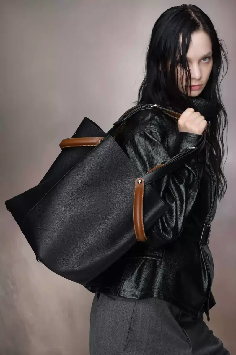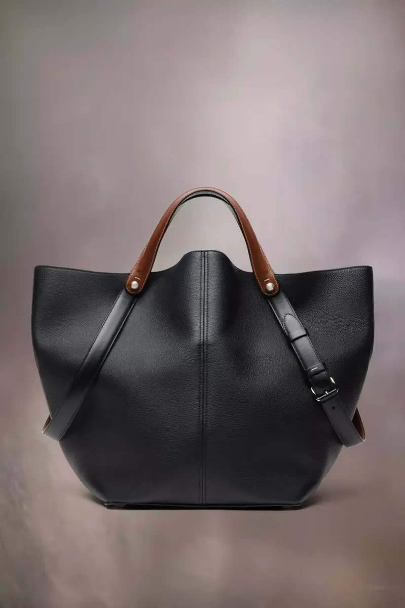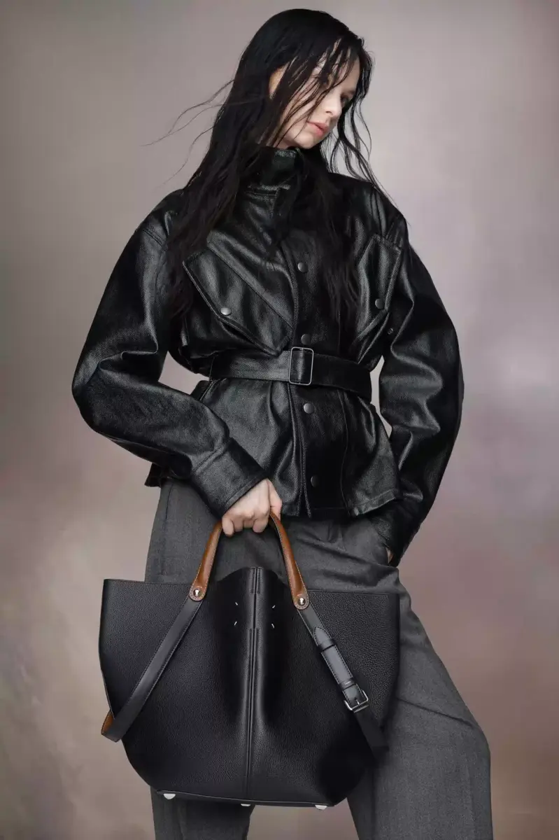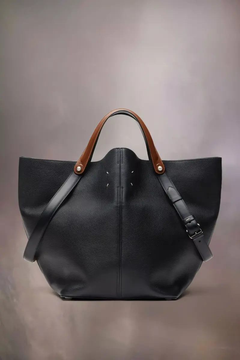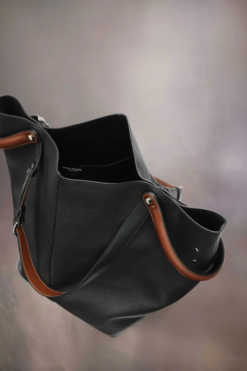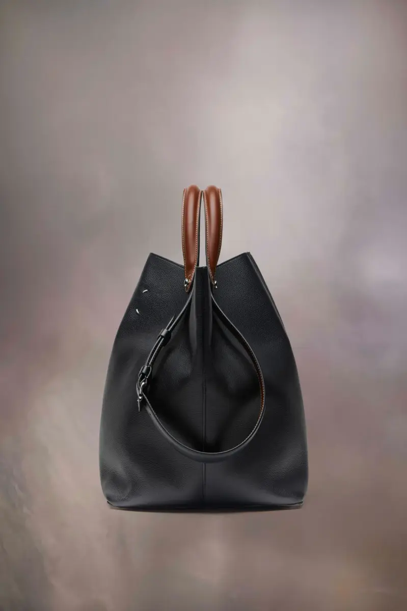 The Maison launches the Dress-age handbag for SS25, crafted from soft pebbled calfskin. With an equestrian spin, the large handbag features classic leatherwork and refined lines, combining unconscious glamour with gestural design. It follows a trapezoid shape with contrast dual-wear strap detail. The studded base allows the bag to stand, and the inner is adorned with the logo. Maison Margiela’s signature, the four stitches, appear at the back; the opposite of a label.